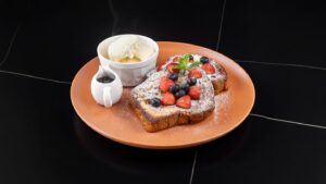 Brioche French toast served with fresh mixed berries, maple syrup, and a scoop of ice cream