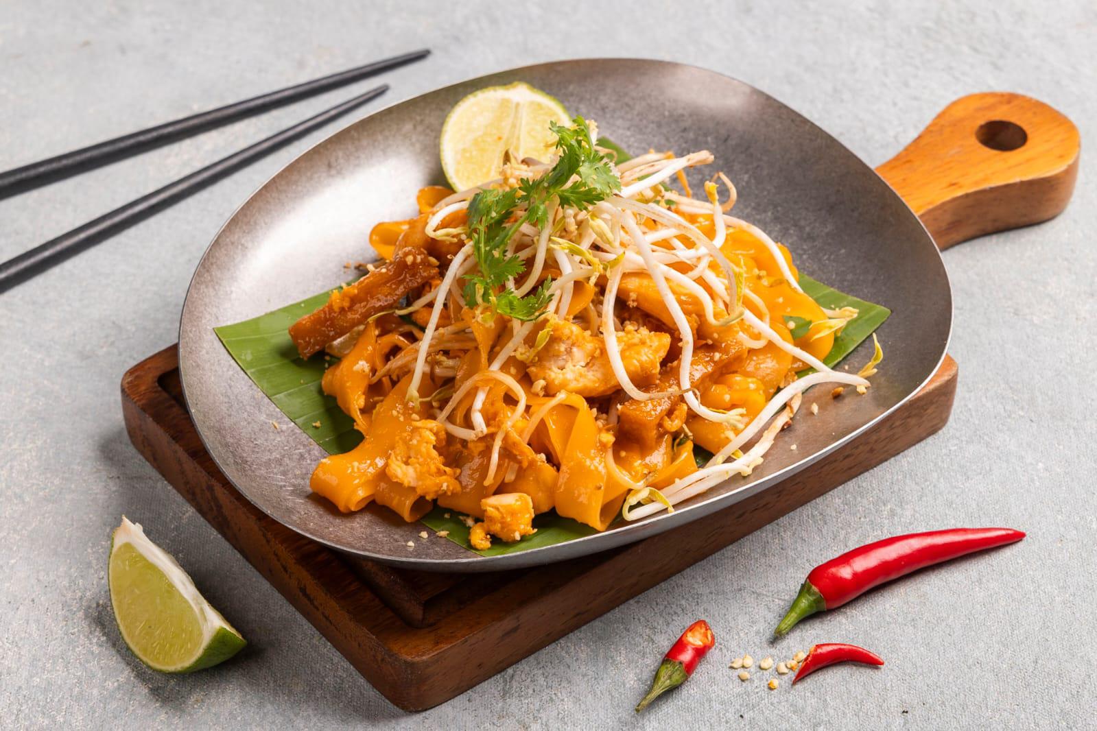 Stir-fried rice noodles with tamarind sauce, peanuts, and bean sprouts