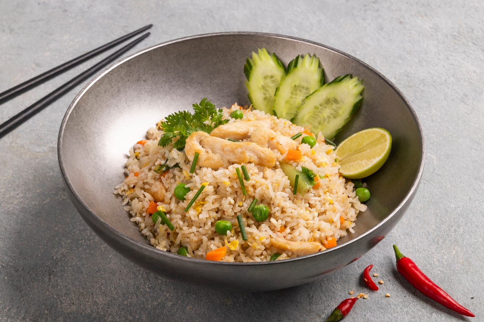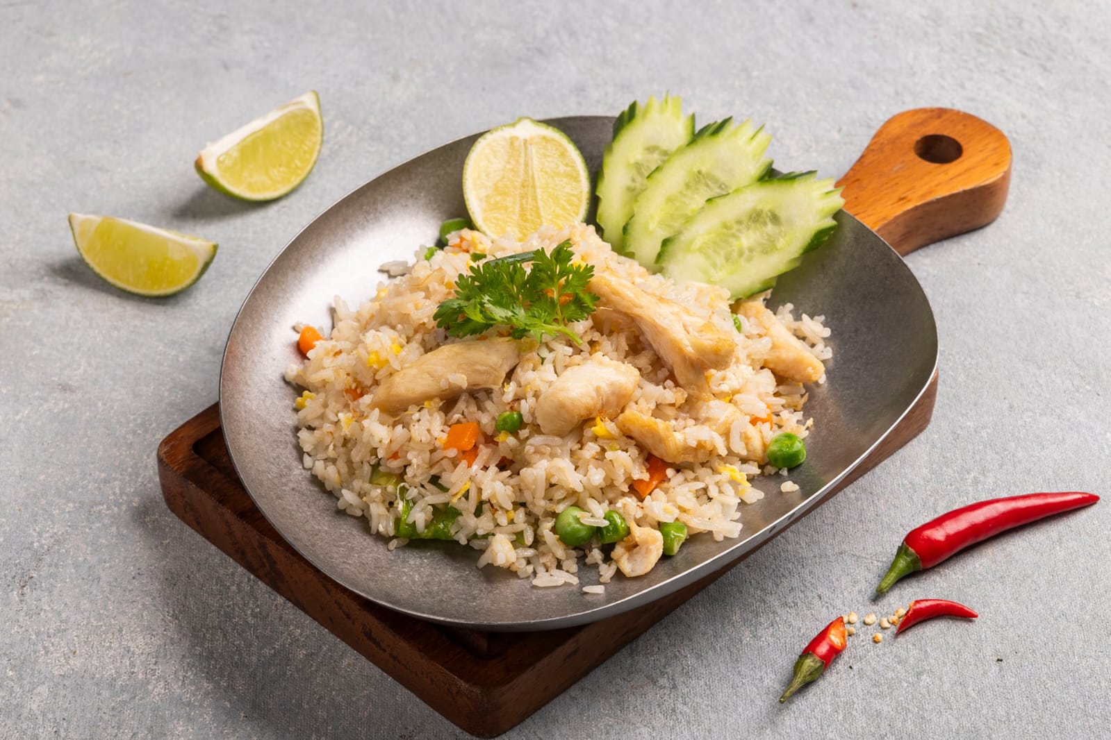 Stir-fried jasmine rice with tender chicken, egg, and vegetables, seasoned with soy sauce and Thai spices.