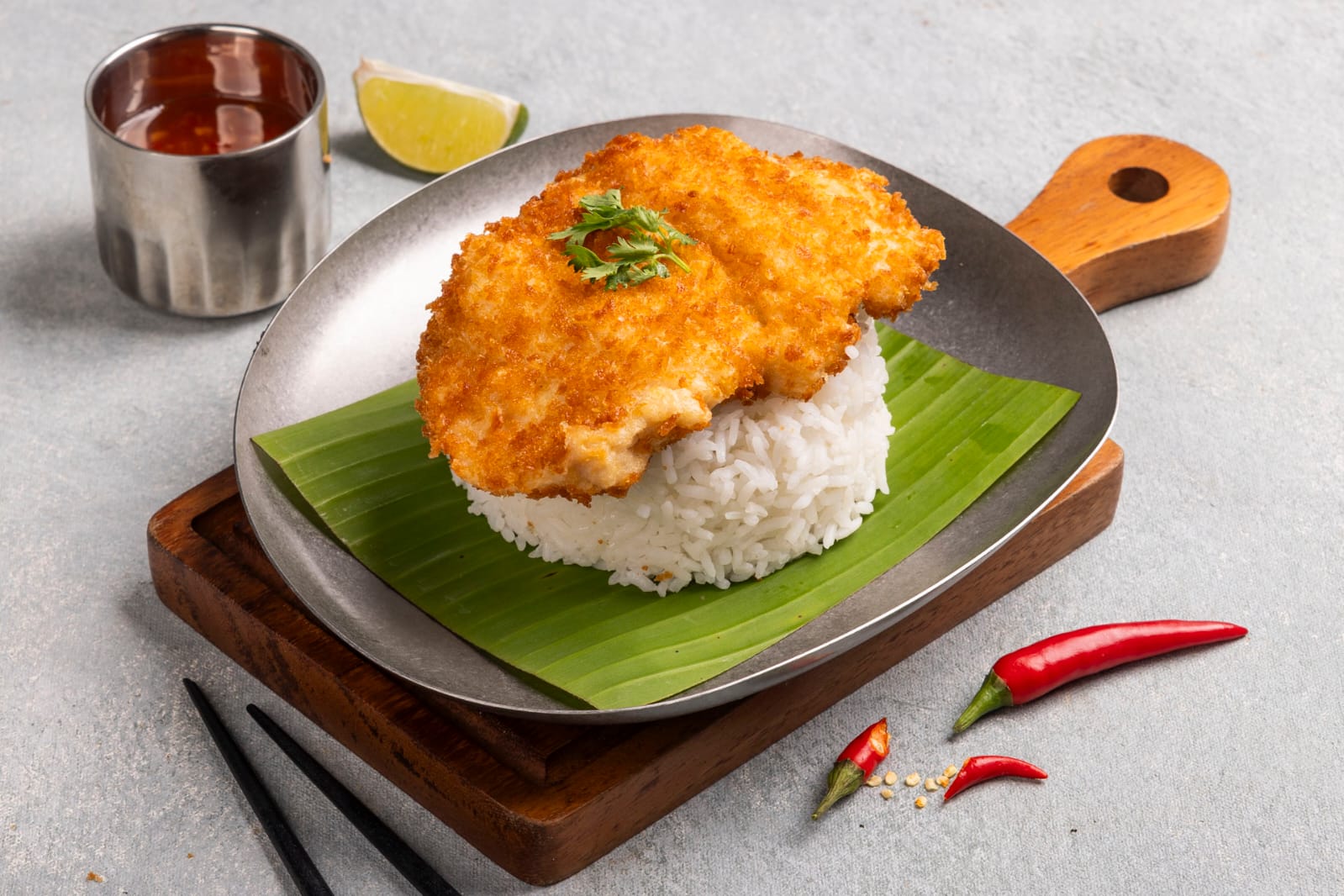 Marinated, deep-fried chicken served with sticky rice and sweet chili sauce