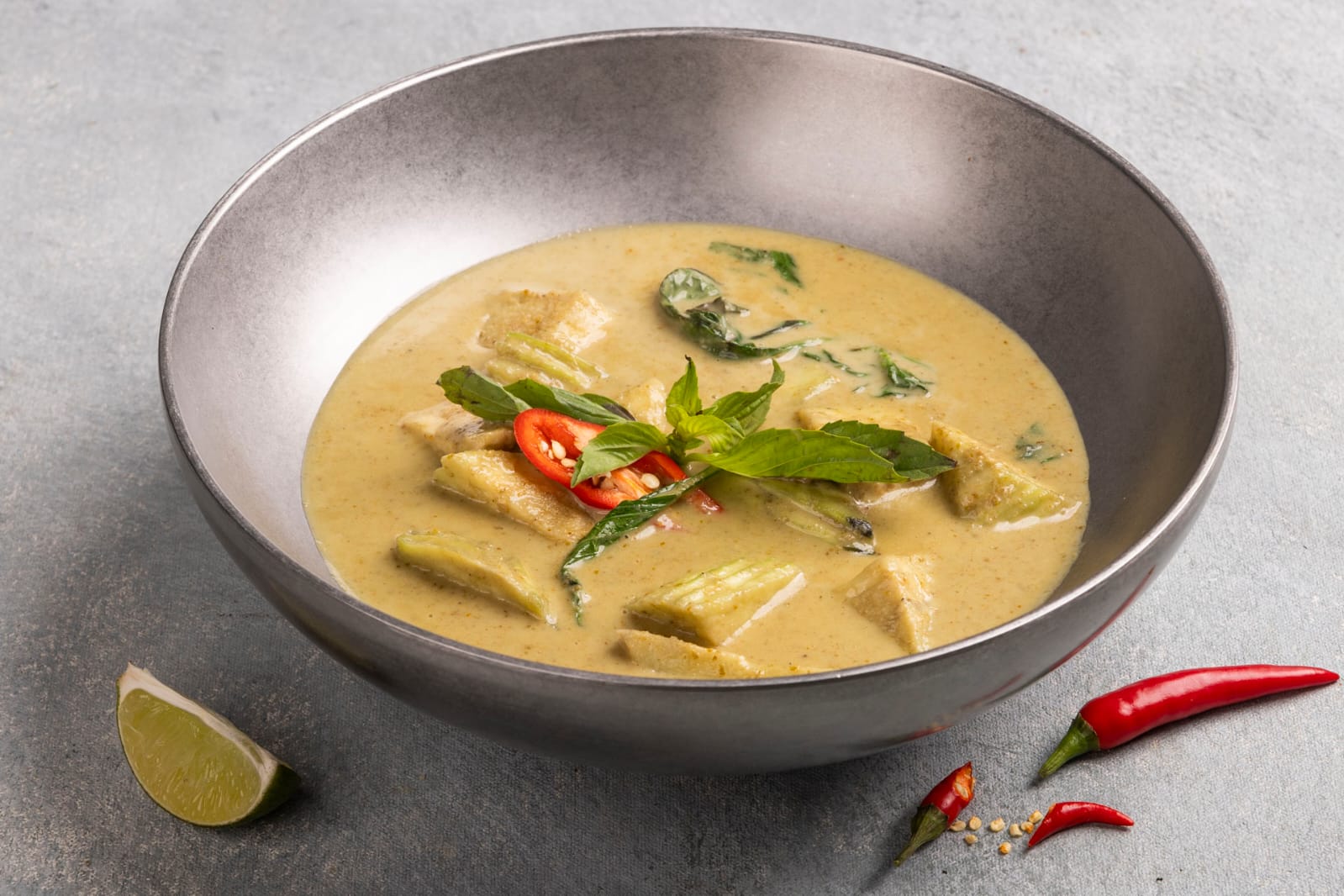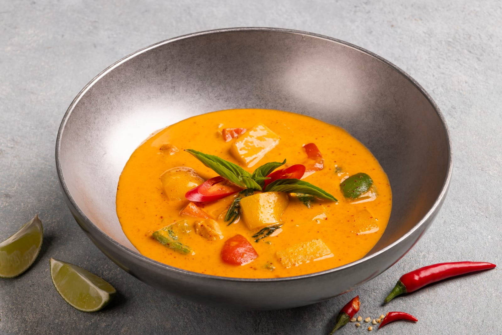 Red Thai curry with bamboo shoots, bell peppers, and coconut milk
