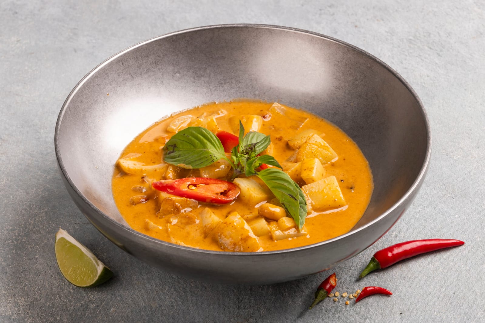 Mild and fragrant Southern Thai curry with potatoes, onions, and peanuts in a rich coconut sauce