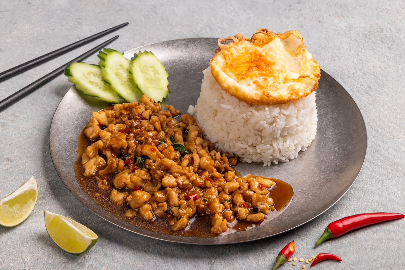 Stir-fry with Thai basil, chili, and garlic, served with jasmine rice and fried egg