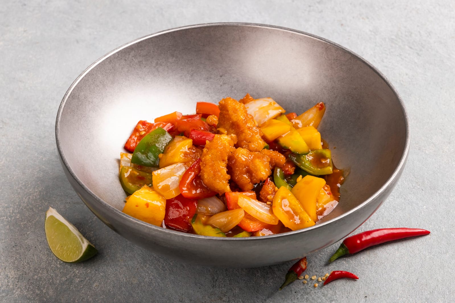 Sweet and sour stir-fry with pineapple, bell peppers, onions. and cucumber in tangy Thai Sauce