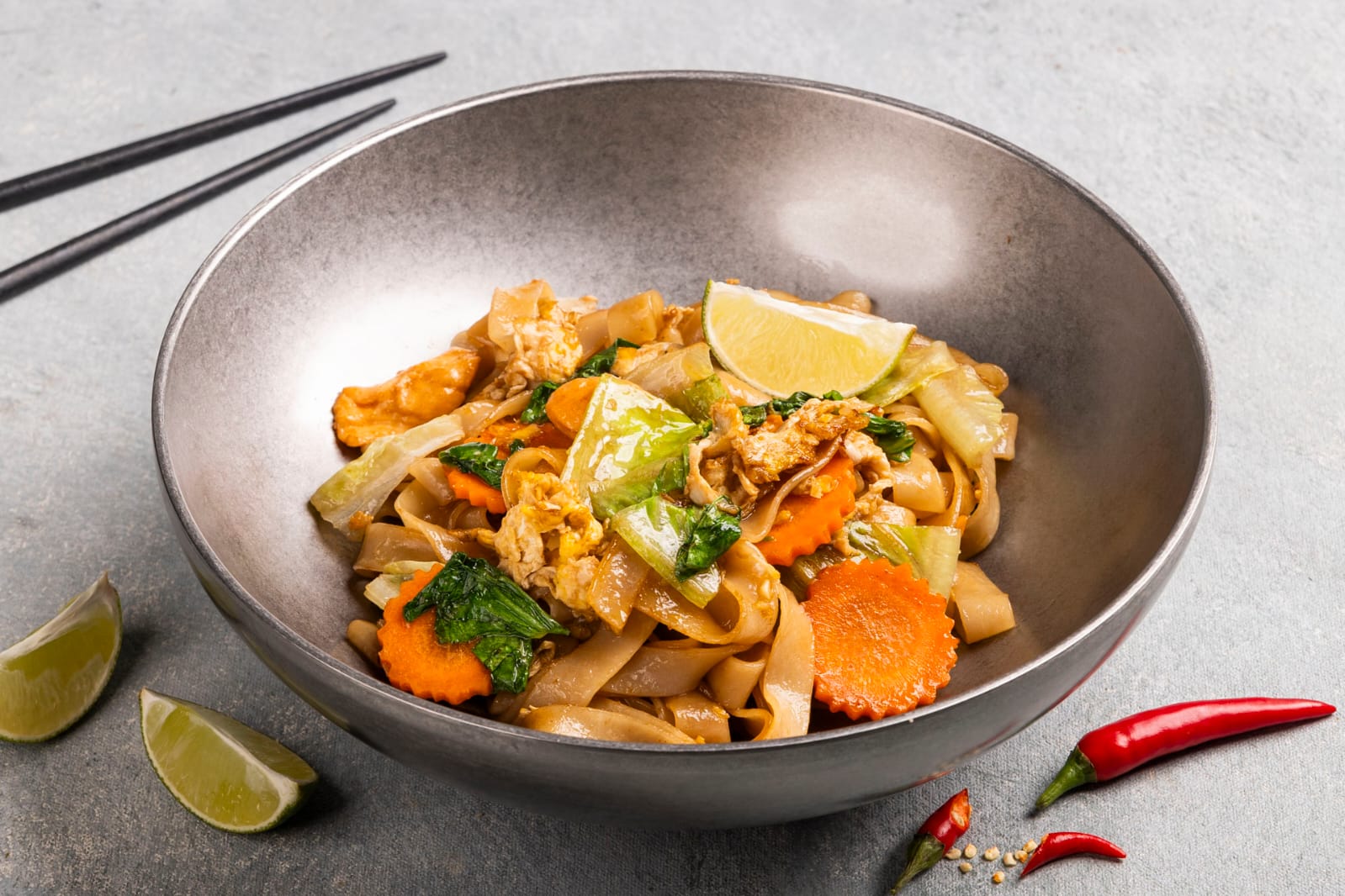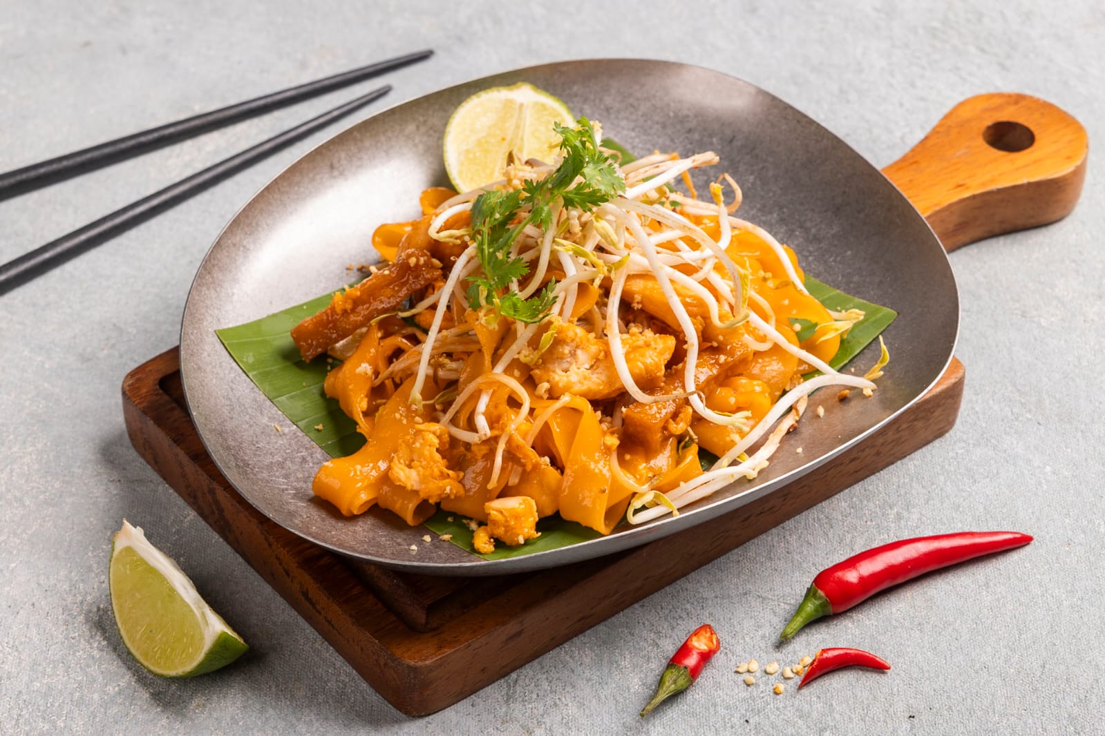 Stir-fried rice noodles with tamarind sauce, peanuts and bean sprouts