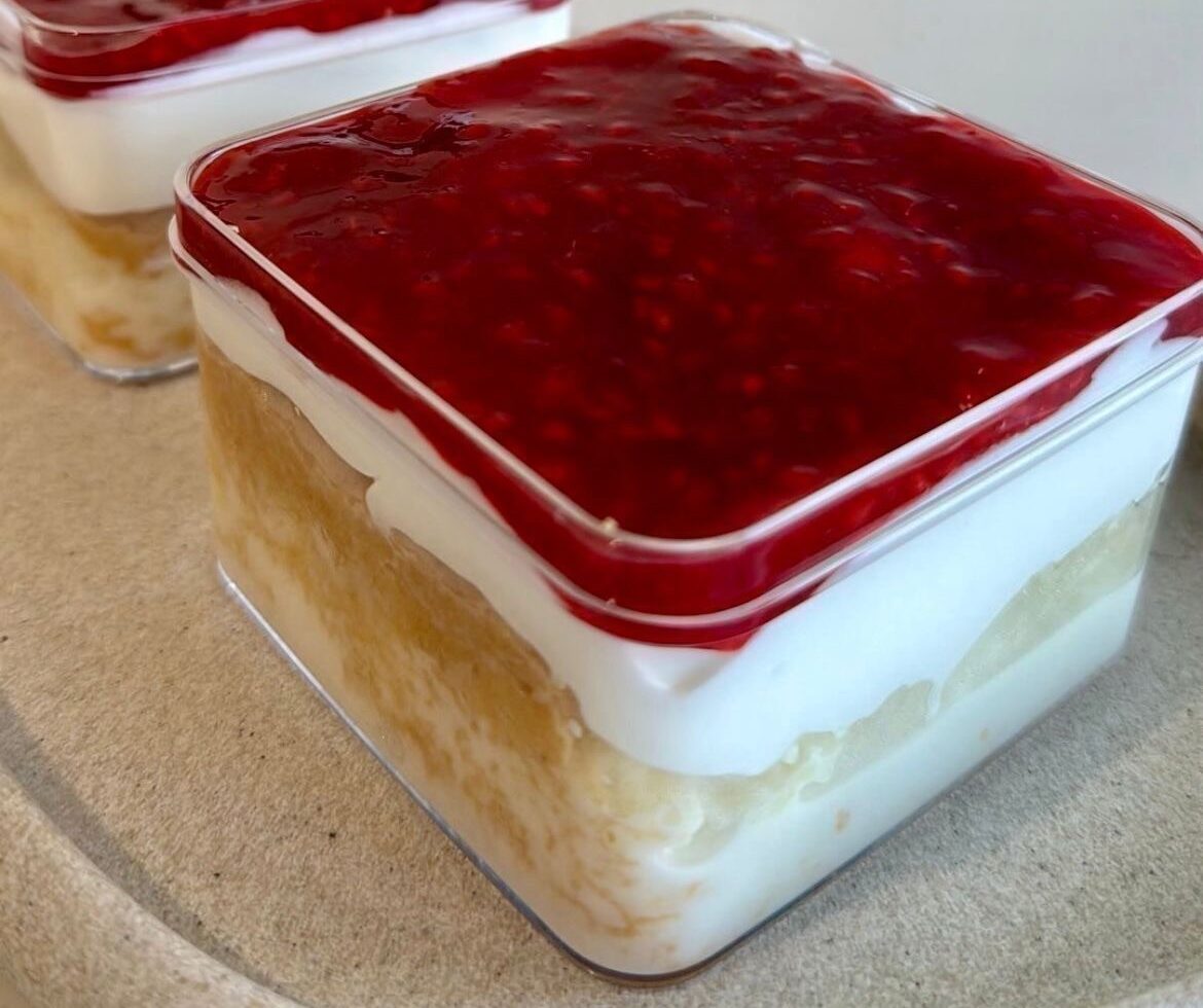 Soft sponge cake soaked in three milks, topped with raspberry coulis.