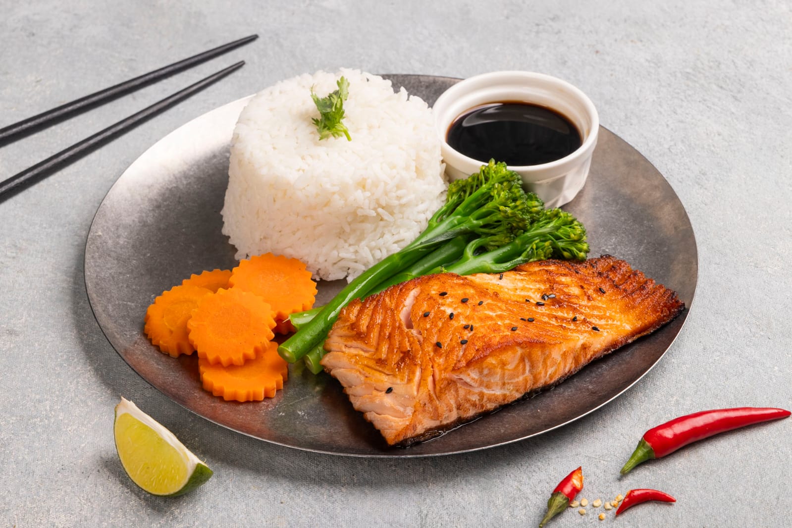 Japanese-stvle glazed salmon served with jasmine rice and vegetables