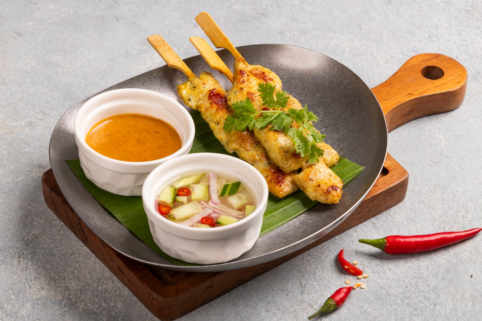 Grilled chicken skewer with peanut sauce, served with fries and ketchup
