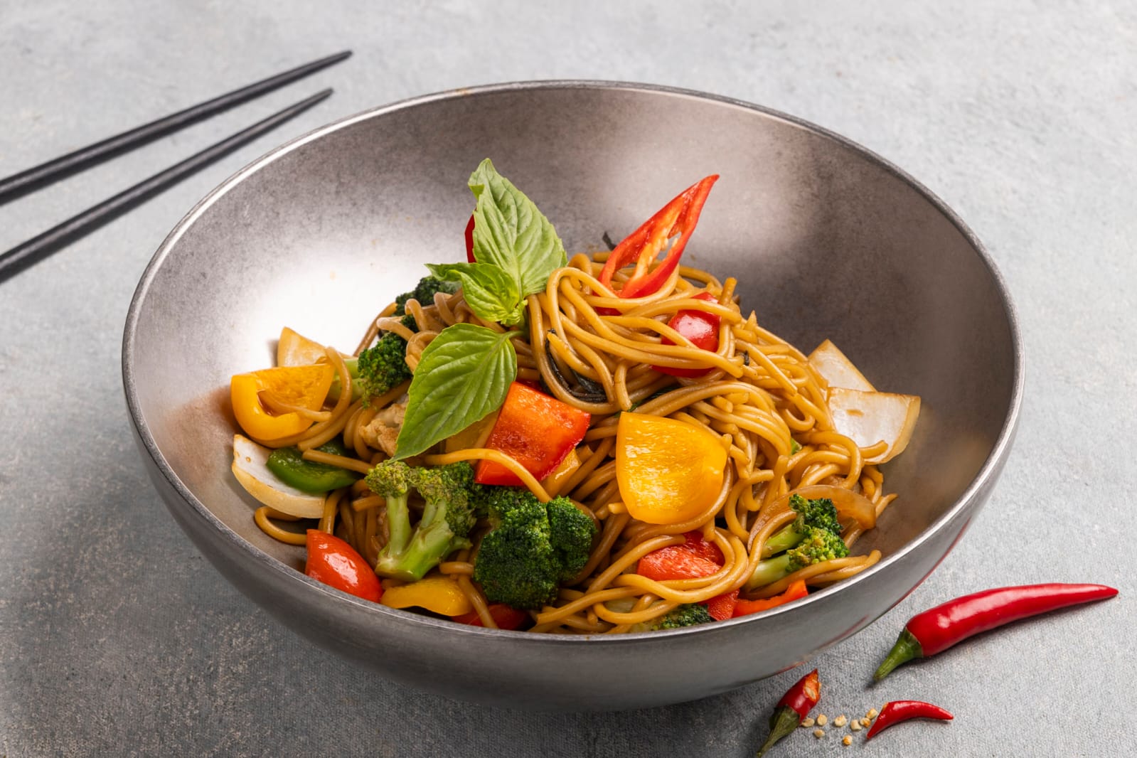 Thai Drunken Noodles made with spaghetti. chili, garlic, and Thai basil
