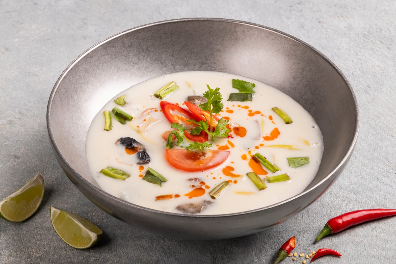 Fragrant coconut chicken soup with lemongrass, galangal, and fresh herbs
