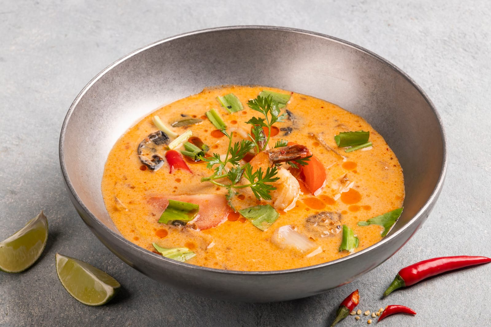 Spicy and sour shrimp soup with lemongrass, galangal, and kaffir lime leaves