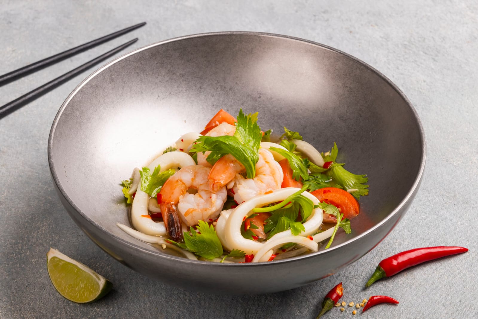 Spicy Thai seafood salad with shrimp, squid, onions, lime, and fresh herbs